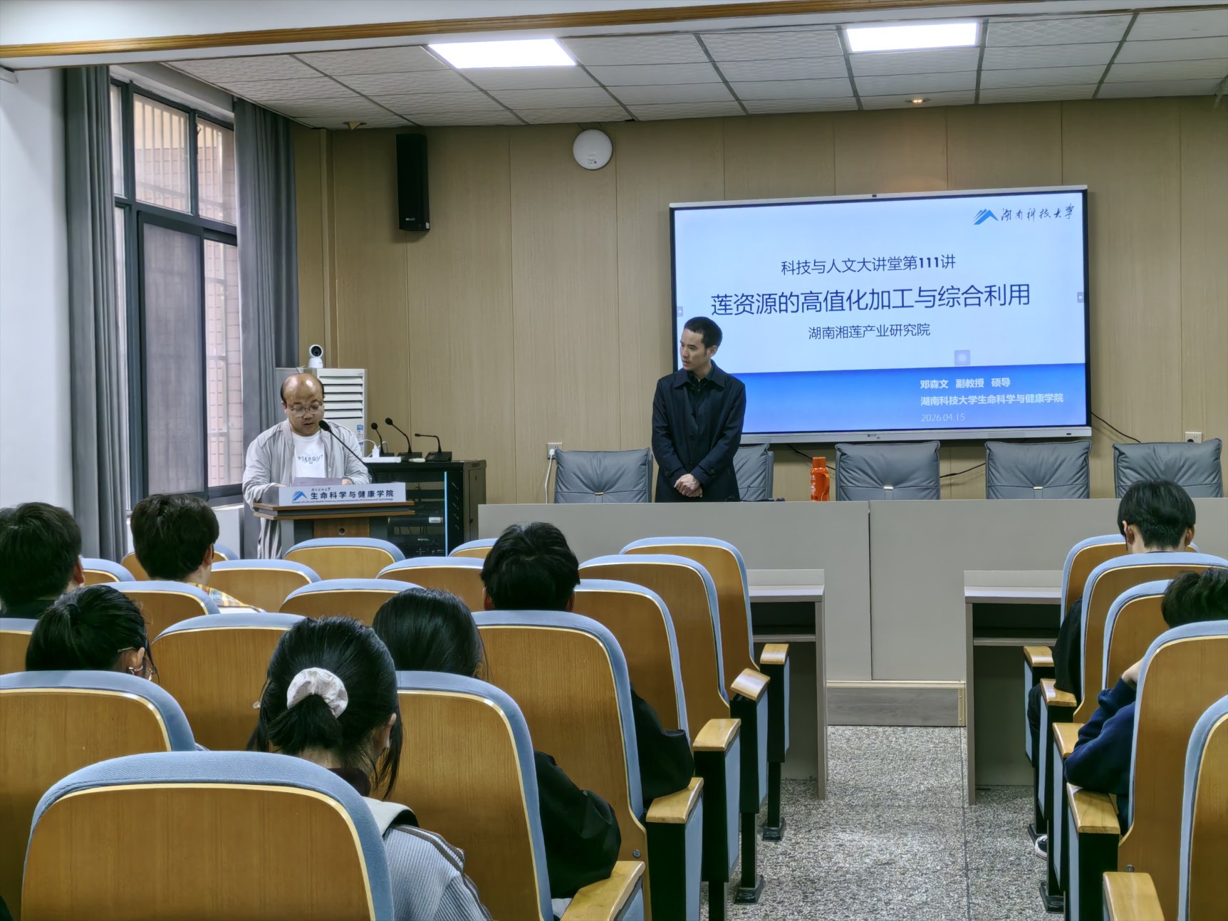 4 月 15 日下午4:00,湖南科技大学科技与人文大讲堂第 111 讲“莲资源的高值化加工与综合利用”在生物楼 105 开讲。本次讲座由yl23411永利集团官网邓森文副教授主讲,副院长李彪主持,全院师生代表观摩学习。